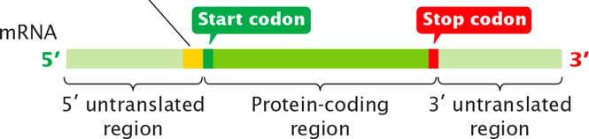mRNA is the template for translation. At the 5′ end has an untranslated region upstream of the AUG (start codon), and at the 3′ end also has an untranslated region downstream of the stop codon.